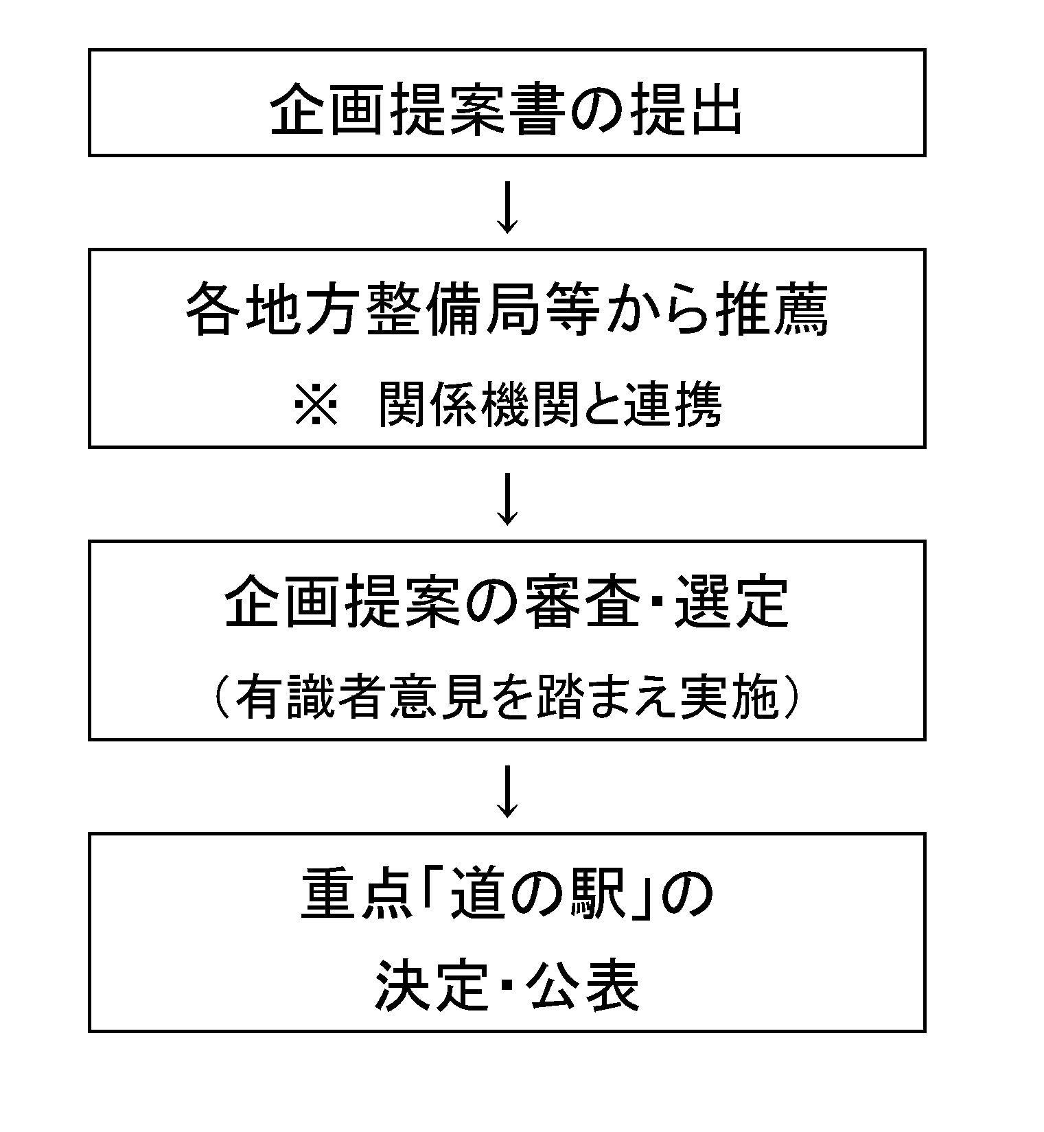 事前相談の結果を踏まえ、企画提案書(様式1)及び必要な参考資料を提出下さい。なお、複数の道の駅が連携した取組を行う場合は、道の駅毎の取組が分かるよう作成して下さい。
