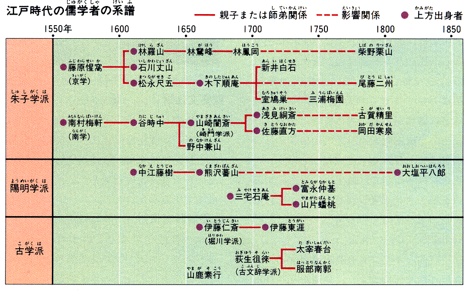 儒教は,日本には5世紀のころつたえられたといわれ,政治や社会に影響をあたえてきたが,最もさかんになったのは江戸時代である。徳川家康に仕えた藤原惺窩(ふじわらせいか)や林羅山は朱子学者であったため,朱子学が幕府や諸藩でさかんになり,封建制度をささえる道徳として発達した。 |