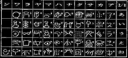 | 宮下文書(富士古文献)より伝承。文字というより符号のような絵文字で表記されている。生活に関連の多い単語(名詞)が31個、数を表す符号(数字)17個にて表現。記数法は五進法から十進法への進化を示し、千単位までの符号(数字)まであり、かなり進んだ文化が背景にあったと考えられる。 |