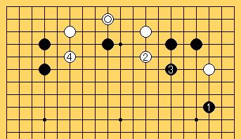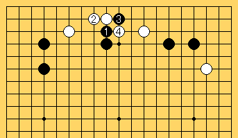 1、2、3、4のやり取りは黒がしつこい。前図の2の手はゴメンナサイと謝っている。その謝っている相手を許さずまだ蹴りかかっている形である。