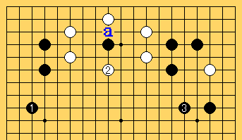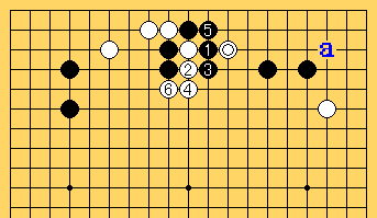 その後、黒1、白2、黒3、白4、黒5、白6まで。最初に打ち込んでいった黒石が動けないし右上にはaの三々が残っているのでたいした地ではない。それに左上の黒2子がすごく弱くなっている。