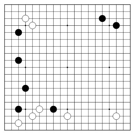 黒先如何。下辺で白が挟んだ局面。上辺や右辺がまだ広い。黒は1子を動くのか。他の大場に向かうのか。