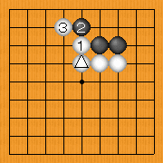 | 上図左のように、白1から3などと次々にアタリをかけるのは黒の外勢を強化するお手伝いになってしまう。右のように単に白1とハネ、白3と進出する方が好形である。 |