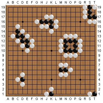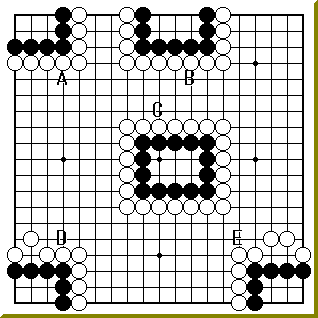 | 上図が板六の形である。黒は6目の地を縦横直線で囲んでいる。これで生きている。 但し、「隅の板六」はダメヅマリになると手入れが必要になる。櫛六との形の違いを踏まえる 必要がある。 |