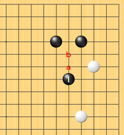 | 相手のコスんだ石からさらにコスめる位置で、相手のコスんだ石の最初の石と同一線上に単独の1子を打つこと。眼形の急所である。 |