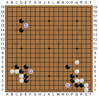 | 次に相手の石の切断をみた手のこと。 相手の弱点の近くに打ち、ツギを 強制するような手。下図で四角マークのついている白(3箇所)はノゾキで ある。次に、D15, E5, P2に打つと黒が分断される。 |