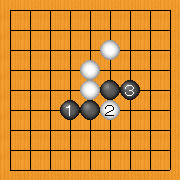 | ダメが詰まった三子の石は、その真ん中から一路離れた位置が急所中の急所である。ここに打つのを 「三子のまん中をノゾく」と云う。 下図黒1が「三目の真ん中」の急所にあたる。白から打つ場合も、同点に打って形を整える。 |