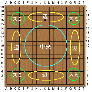 | 碁盤の隅から数えて(三、3)の地点。布石の段階で隅の着点として単独で打たれる他、星や高目、目ハズシなど位の高い着点に対する隅への侵入手段として打たれることも多い。 | ||