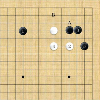 | 1間トビ&小ケイマ。黒のサガリからスベりは白の全体を大きく攻めようとする手である。 同じようでもA、Bの方へ動くのはハサミが働かず攻めにならない。 |