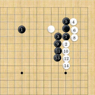 | 白の三三入りに上辺を囲おうとするも、アキ三角の愚形から車の後押しと俗筋の見本のような手が続く。 白1子も死にきっておらず、白の実利が大きく勝る。 |