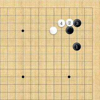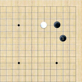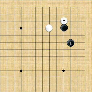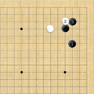 | 星&1間高がかりに対し小ゲイマ受けの手である。辺を一手で打ち切って先手を取る意図がある。これを「元図」とする。 応じ手として、A(三三ツケ)、B()、C()がある。 |