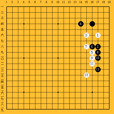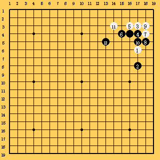 | ハネ。いきなりのハネは珍しいが小ゲイマにスベって早く治まろうとしている手である。 |
