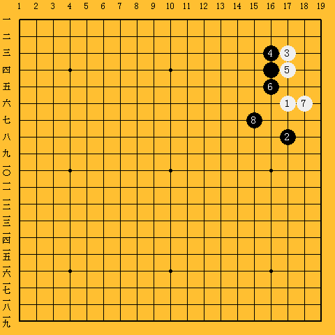 | (次の着手) ハネ&1間トビツケ&割り込み&当たり&ツギ&ツギ&ハネ当たり |