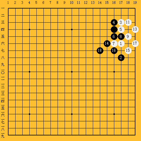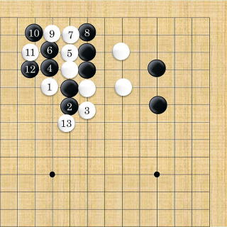| 下がり。この手は、三三入りした白を隅に閉じ込めて生かそうと云う手である。 |