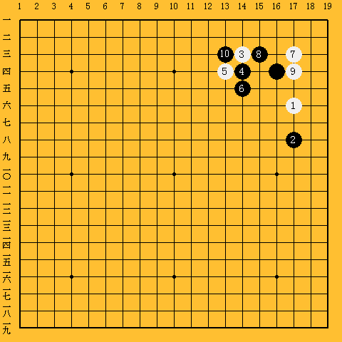 星&小ゲイマ小ゲイマガカリに対し一間ハサミの手がある。これを「元図」とする。最も厳しい打ち方である。この後、非常に変化が多い。 |