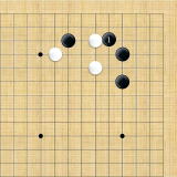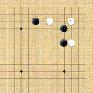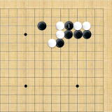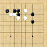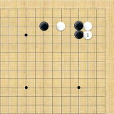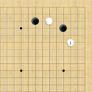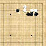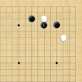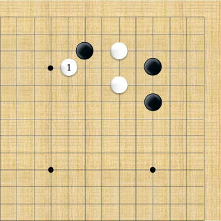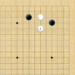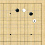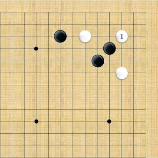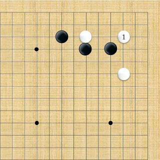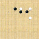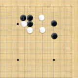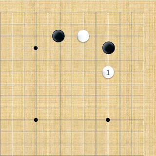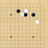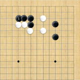 | 小ゲイマ。白は小さく低位で生き、黒に厚みを与えない場合の手である。この後の黒はいろんな打ち方がある。 |