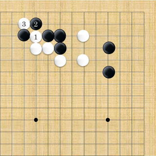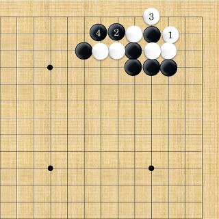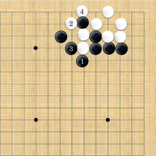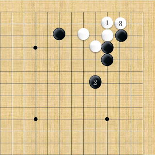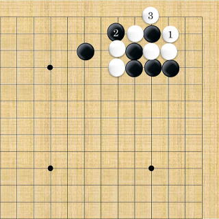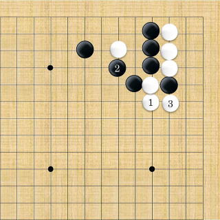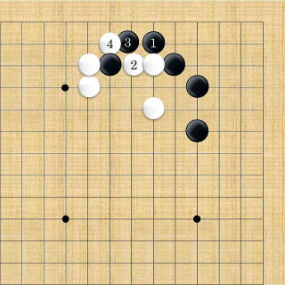 | 下がり&ケイマ&隅曲がり。白3が肝要な手。但し、全局的な判断で保留することもできる。 |