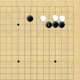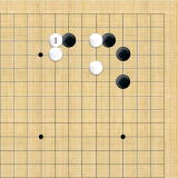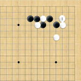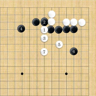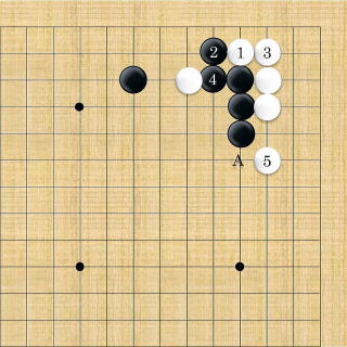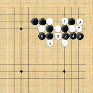 | 白1のアテから3と切断する。黒4と逃げても白5から7とされ、白に良い形で破られた上に白9で隅の一子を取り込まれてしまう。 |