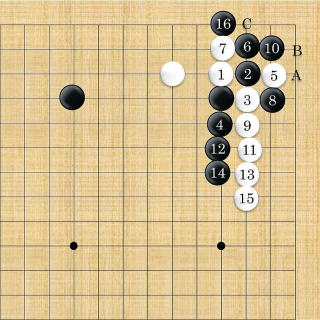 | ハネ&ノビ&ノビコミ。応じ方として、A(両バサミケイマへのツケ)、B(押え)、C()がある。 | ||||||