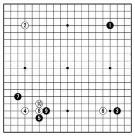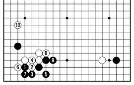 黒5に白6とかかり、黒7の両ガカリに白8、10とツケノビました。黒先如何。