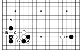 黒1三々入り。白2押さえ、黒3渡り、白4切りまで。定石となっているが疑問である。全体の配置によるが部分的には白が厚い。本図では右下隅のカカリがいい位置にあるので白がはっきりいい。白Aと詰めてBの置きを見るのも有力だし、Cと伸びて利かす場合もありそう。
