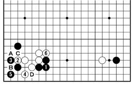 黒1ツギ。こう頑張るべき。白2に黒3ハネ、白4コスミに黒5カケツギ。白6の曲がりは攻防の要点。ここから競り合いになるが互角の戦いが予想される。蛇足になりますが、白4でAと押さえ、黒B、白C、黒Dと渡られるのは黒の実利が大きく、白が甘い。