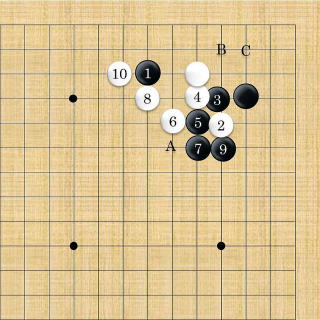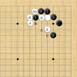 | 指了図。白10まで互角のワカレである。この定石はAが双方の勢力の要点になるほか、黒Bか白Cかでヨセとして20目以上の出入りとなる。 |