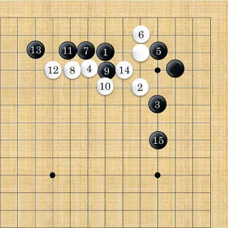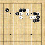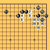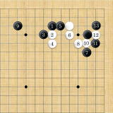 | 白のデギリに対し、黒が辺を重視するな場合には黒13とツグ手もある。白も先手を得ているので隅と辺のいいワカレとなる。白はツケノビて上辺を固めたからには棋理うえから13から切ることはありえない。 |