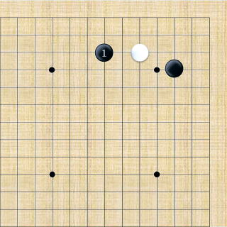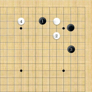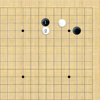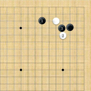| 1間バサミ。 白は上辺をハサんで攻める。 |