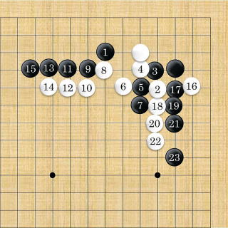 | 指了図。白16の手筋で一子を逃げ出す。黒23まで地と厚みのいいワカレである。途中で複雑な変化がいくつもある。 |