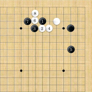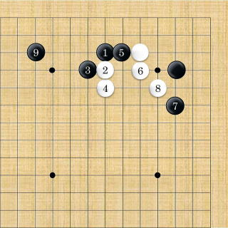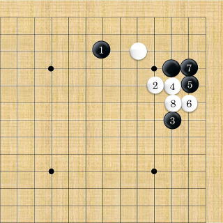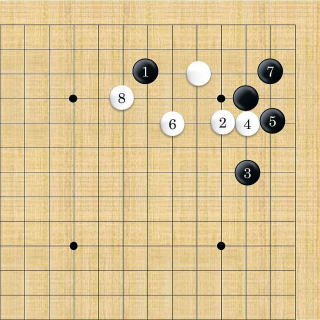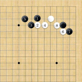 | ハネ。白8に黒が上辺をハネれば戦いになる。 |
