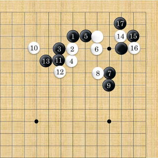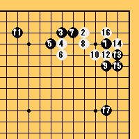 | 指了図。黒は11と白の形にフシをつける。白は16と整形し、黒も17と備えて一段落する。 |
