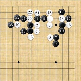 | 以下黒25までとなる。白20からの切り取りに黒23も手筋である。 |