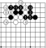| 黒の出キリに対し白はサガる。黒は白2子を取りにいく。白はアテを利かし出キリする。以下、黒7から白14まで、黒のハマリで白良しの図となる。 |