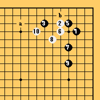 | 白8の両ニラミのコスミには黒9としっかり守る。白10とカケて一段落。この後、黒は窮屈な3の動き出しは狙わず、aやbの利かしを狙うのが本筋である。 |