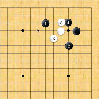 | 指了図。白は3とコスミ出すことになるが、そこで黒4、白5と進めば、小ゲイマガカリに一間バサミの変化に還元する。黒はAと上辺を守るのも有力。 |