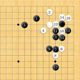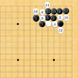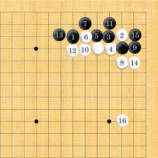 | 指了図。白12、14を手順に利かし16とヒラいて一段落する。黒は実利と先手を得たことに満足する。 |
