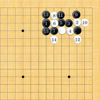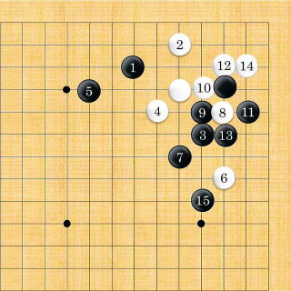 | 指了図。黒7と上から切ってアテれば白は二子にして捨てて形を決める。黒15まで白は先手を取って形を得たが黒は二子を取って厚い。 |