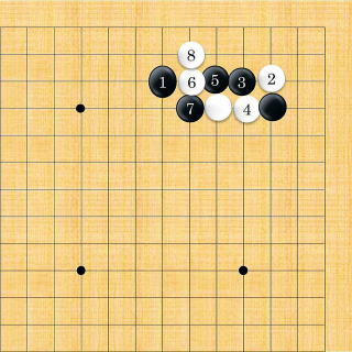 | 当て&ツギ&ハイ。白は黒1子を抜くのは利かされで、右辺の二子を捨てて上辺の三子を助ける。 |