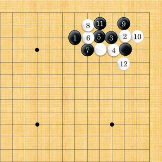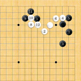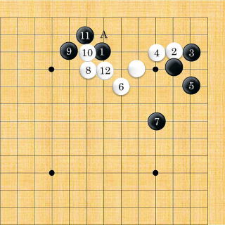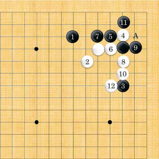 | 指了図。黒はハウのは重いので9とトブ。白は一旦突き出して12と戻るのが手厚い。白12ではAの切りも成立するがコウ含みの難解な攻め合いとなる。 |
