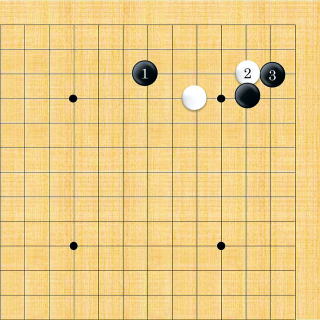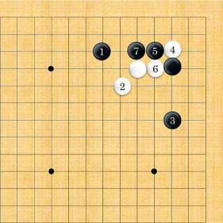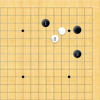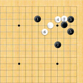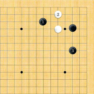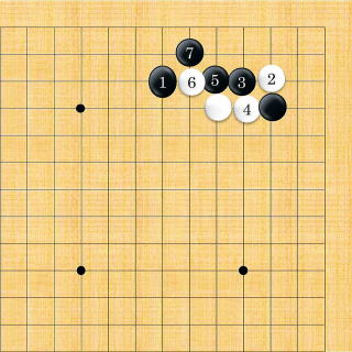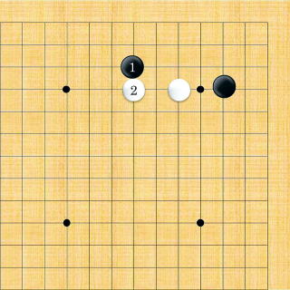 | 小ケイマ。白の手抜きに黒が抄ケイマに攻めるのは白の動きを催促する意図である。 |