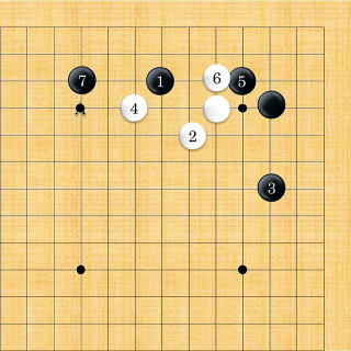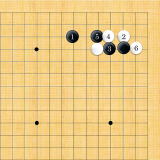| 指了図。白6とツグ。黒は7とヒラいて両辺を打つ。黒の頑張った打ち方だが白も厚いので戦える。 |