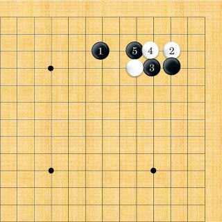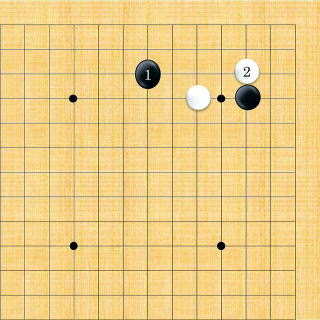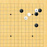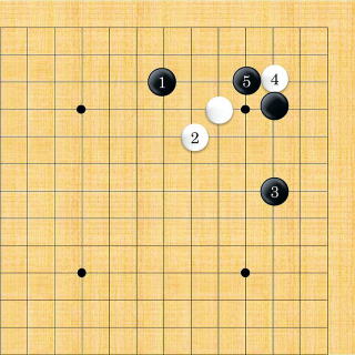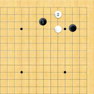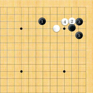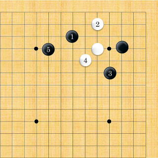 | 2間ビラキ。黒が5と二間にヒラくのは白に攻めの調子を与えない手法である。 |