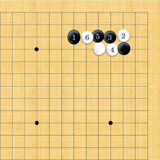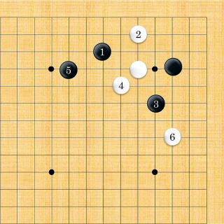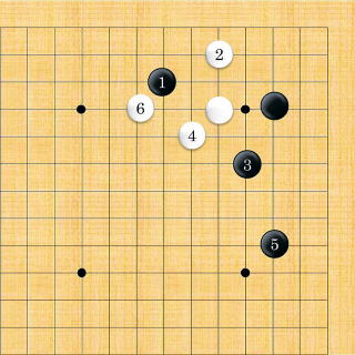 | 指了図。黒が3、5と右辺に備えれば、白6と上辺にカケて一子を攻める。この後、黒は一子を動き出すのは重く、外から利かして捨てることが多い。 |