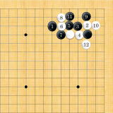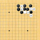 | 指了図。白8、10と突き抜いて12と構え上辺を取る。これも互角のワカレと見られる。 |