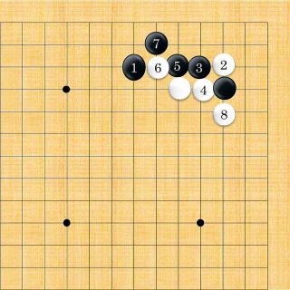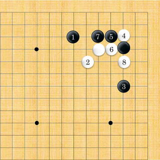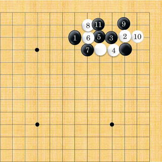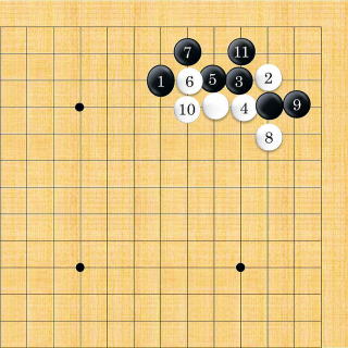 | コスミ。黒は一子を動き出すのは重いので5のコスミを利かして隅を確保する。 |