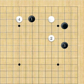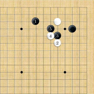| ハネ。昔は引いて打つのが定石になっていたが現代はハネて地にからい定石を選択するようになった。 |