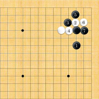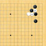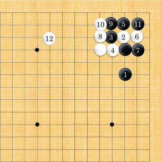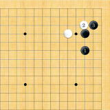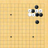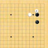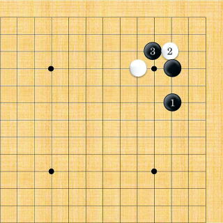 小目&1間高がかりに対する一間トビ受けの形である。上小ケイマ受けに比して位は低いが、その分、隅に対しては堅実である。白は利かしと見て手を抜くことも考えられる。 |