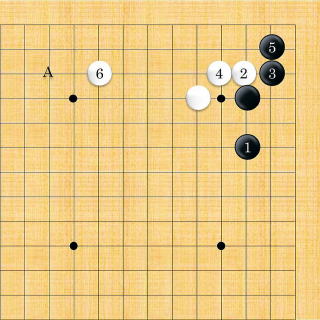 | 指了図。白6のヒラキまでで一段落する。黒は位が低いので上からカケる狙いはないがAのツメが好点として残っている。 |