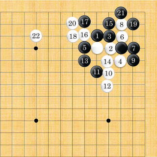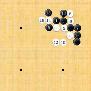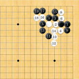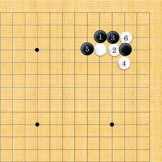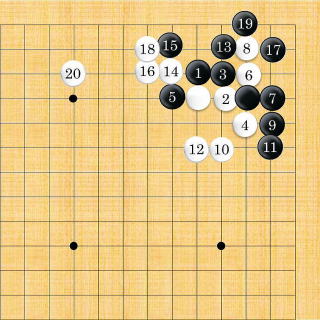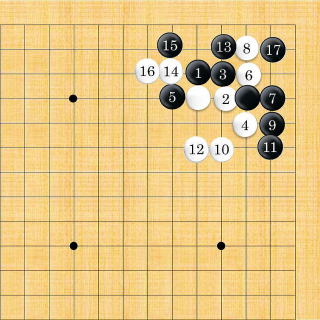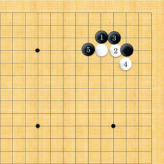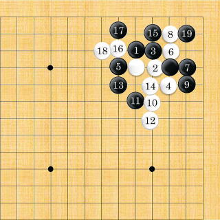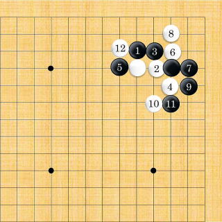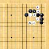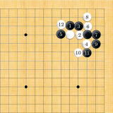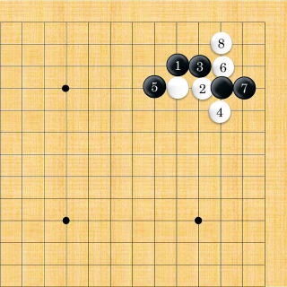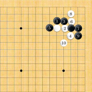 | 当たり&ツギ&隅2子の沿い付け下がり曲り。隅2子の沿い付け下がり曲りの手は隅の手数を伸ばしている。 |
